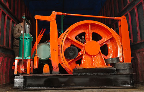 該提升絞車的主軸裝置有固定卷筒、活動卷筒(僅雙筒用)主軸、兩個軸承座、調繩機構(僅雙筒用)等部分組成,用來纏繞或釋放鋼絲繩。單筒提升絞車鋼絲繩為上出繩,雙筒提升絞車活動卷筒為下出繩,固定卷筒為上出繩,卷筒上裝有襯木。